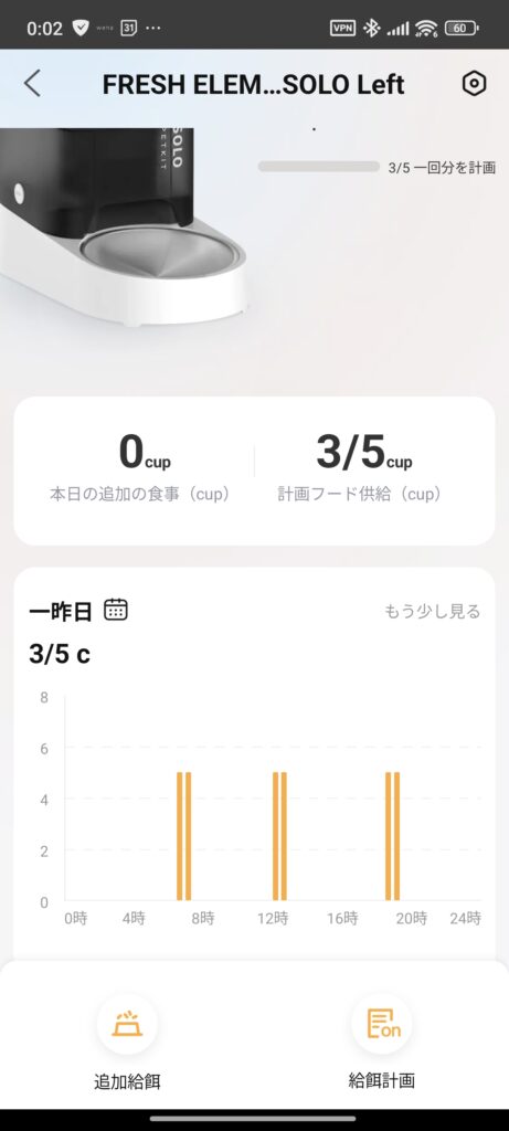 食事の管理: 以前は「これくらいかな?」と目分量であげていましたが、今はアプリで「朝7時に20g、昼12時に20g…」と10g単位で設定可能。