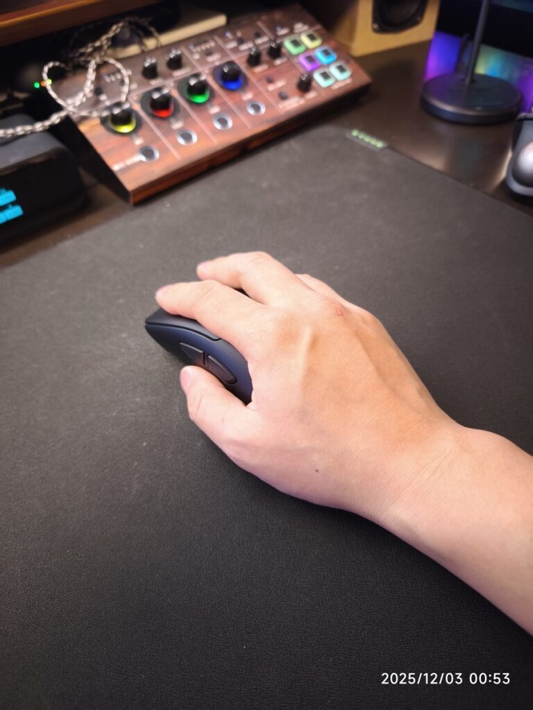 マウスの背中(盛り上がっている部分)が、手のひらのくぼみにピタッとハマる感覚。 Sora V2を使っていた時は、指先でマウスをコントロールするために常に少し緊張感があったんですが、DeathAdderはマウスの方から手に寄り添ってくれる感じです。