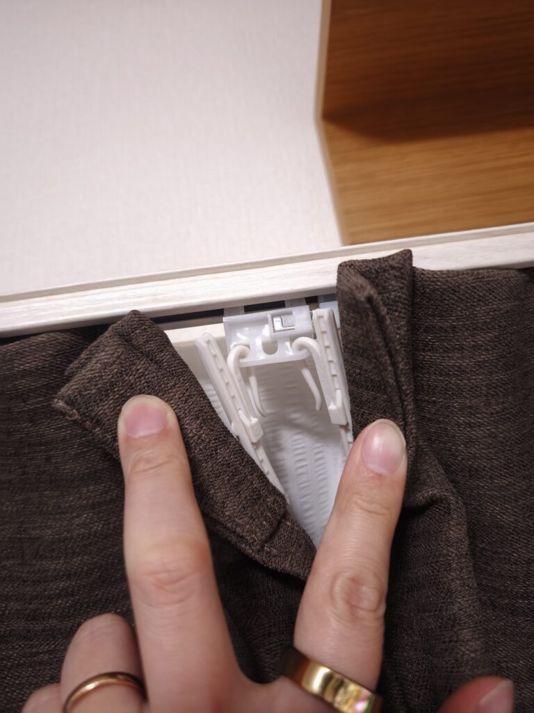 やり方は簡単。 「中央のマグネットランナーに、左右両方のカーテンのフックを一緒に引っ掛ける」だけ。